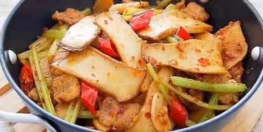 杏鮑菇洗凈,從中切兩半,然後豎切成大片備用。五花肉切片備用。姜、蒜切成薄片,小米椒切小段,芹菜洗凈切寸段,郫縣豆瓣醬用刀剁得細碎一些。炒鍋倒少許油,油溫至八成熱時,分批下入切好的杏鮑菇略煎至金黃變軟,盛出備用。鍋中留底油,把五花肉片放入煸炒至變色,將五花肉中的油煸炒出來。把五花肉片撥至一邊,放入姜、蒜片和辣椒煸香,再下入郫縣豆瓣醬小火煸炒出紅油。然後將煎過的杏鮑菇和芹菜段倒入大火翻炒。調入生抽、糖翻炒均勻。即可裝入鍋仔,上桌享用~~