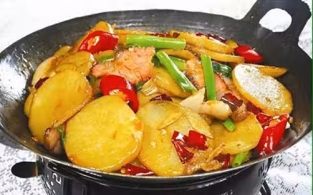 土豆削皮切片,用水浸泡後瀝干起鍋,倒入油。放入土豆片慢慢煎,直至土豆片外焦里軟為最好,出鍋裝盤鍋內放入少許油,先下薑片,蒜。放入一大勺豆瓣醬煸出香味後一次放入肉片,香菇和胡蘿蔔最後將土豆放入鍋中,鍋內加入少許開水進行翻炒,將水份煸干,放入蔥出鍋