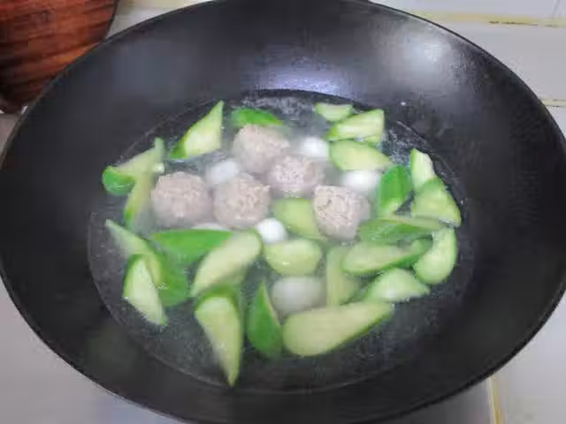 6.再把腌制出水的絲瓜撈起入鍋,加入鵪鶉蛋燒開後。