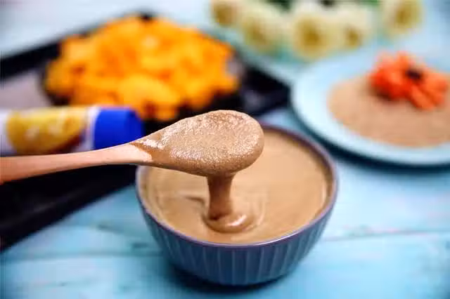 芝麻醬是大家非常喜愛的香味調味品之一。有白芝麻醬和黑芝麻醬兩種類型。根據用途來看,火鍋麻醬是常見的一種,麻醬的原料選用精製白芝麻。做工精細、色澤金黃、口感細滑、口味醇香。我今天這芝麻醬是咸甜味道的,香味濃郁,細膩幼滑,適合抹麵包,做千層餅餡料,還可以做蛋糕卷呢,想想都禁不住口水直流。