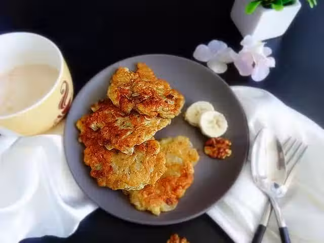 材料:香蕉1根(熟透)、核桃仁30克、麵粉半小碗、雞蛋1個、油適量
