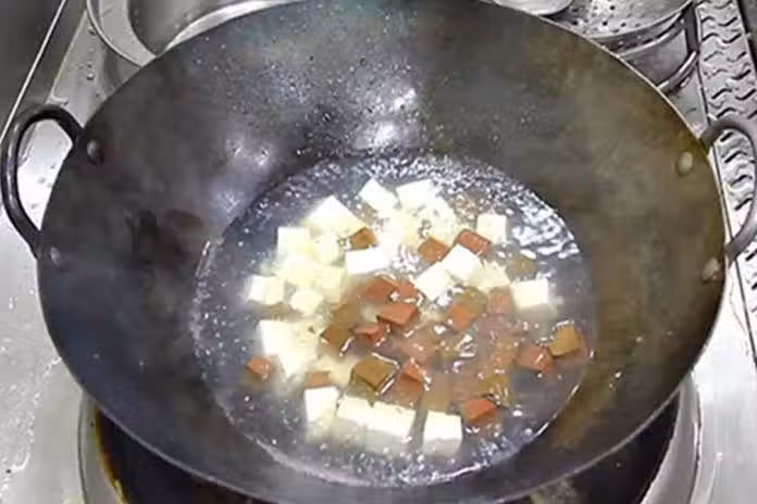 2.鍋中加入清水,涼水放入豆腐和豬血,加入一勺食鹽入底味,汆煮1分鐘左右去除腥味,然後把豬血和豆腐倒出來、瀝水備用。