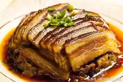 6、蒸好的扣肉端出蒸鍋,把盛裝扣肉的碟子扣於碗上,翻過來,去掉扣碗,淋芡汁即可上桌食用了。