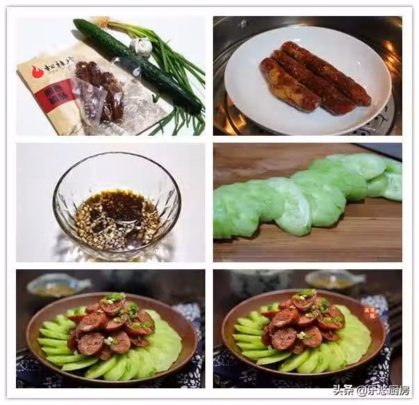 第五步:將麻辣香腸切成片,與黃瓜一起放入盤中,再撒少許小香蔥點綴。吃的時候,蘸上碗汁非常美味。(簡單幾步就做好一碗下飯小菜,這種做法是吃香腸的基本吃法,大家可以試試)