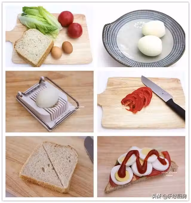 第六步:取一片麵包,依次放上生菜,西紅柿片,雞蛋片,再擠上少許番茄醬,然後蓋上麵包片,這樣依次把整個三明治做好。