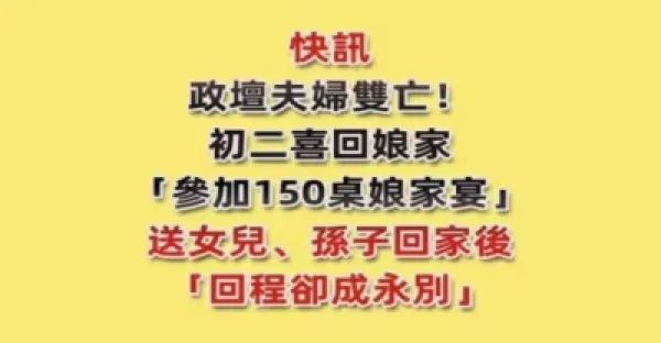 快訊/政壇夫婦雙亡 ! 初二喜回娘家 「參加150桌娘家宴」送女兒、孫子回家後「回程卻成永別」