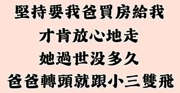 爸爸出軌!患癌媽媽臨走前「要爸爸買房給我」媽媽走後「爸爸轉頭就跟小三雙飛」現世報卻來了!