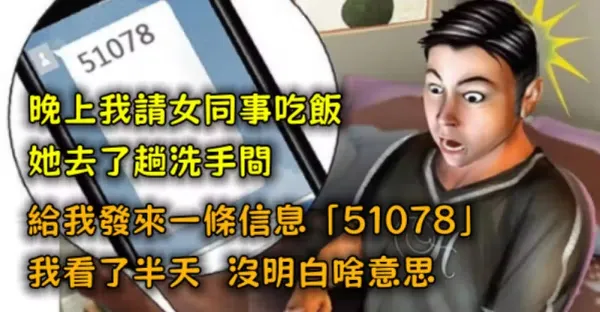 晚上我請女同事吃飯,她去了趟衛生間,給我發來一條信息,「51078」,我看了半天,沒明白啥意思。