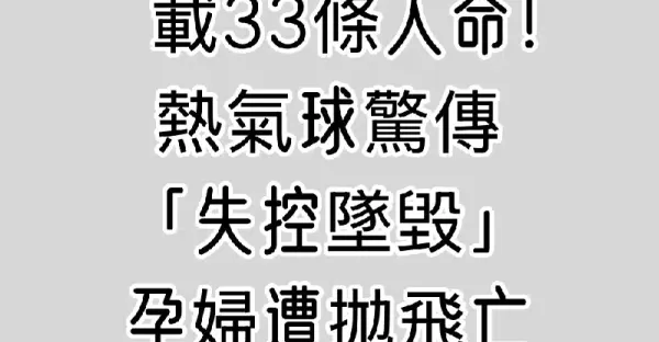 最新/載33條人命!熱氣球驚傳「失控墜毀」 孕婦遭拋飛亡「才新婚不久」