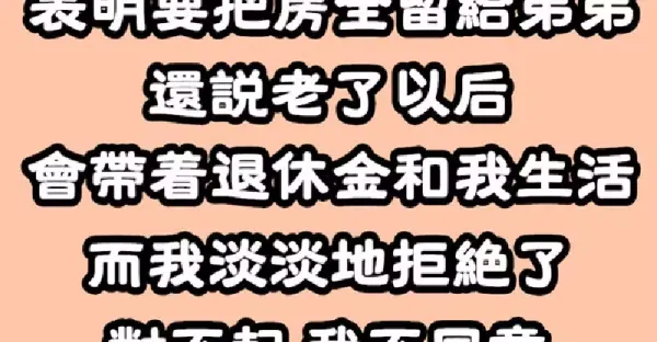 爸媽日前公開遺囑,表明要把「三套房全留給弟弟」還說老了以後「會帶著退休金和我生活」而我淡淡拒絕「對不起,我不同意…」 # 一句話道盡辛酸