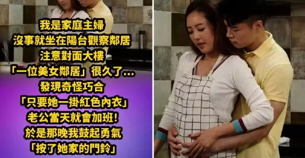 我是家庭主婦,沒事就坐在陽台觀察鄰居,注意對面大樓「一位美女鄰居」很久了...發現奇怪巧合「只要她一掛紅色內衣」老公當天就會加班! 於是那晚我鼓起勇氣「按了她家的門鈴」...