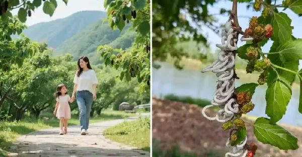 出門玩女兒突尖叫「那是什麼!」,寶媽順手勢望去桑樹驚現「白絲瀑布」急逃遠,看完網友評論驚出一身冷汗:還好跑得快