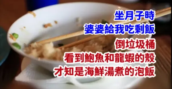 坐月子時婆婆給我吃剩飯,倒垃圾桶看到鮑魚和龍蝦的殼,才知這是海鮮湯煮的泡飯