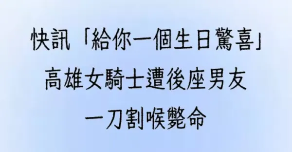 快訊/「給你一個生日驚喜!」高雄女騎士遭后座男友一刀割喉斃.命