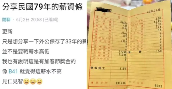 翻出阿公「34年前薪資單」,網見全勤獎金額哀號:別說了