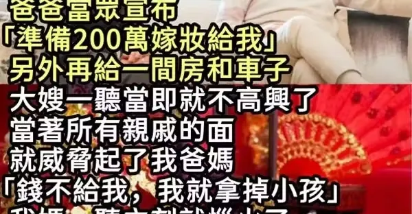 爺爺的生日宴上,爸爸當眾宣布「準備200萬嫁妝給我」另外再給一間房和車子,大嫂一聽當即就不高興了,當著所有親戚的面就威脅起了我爸媽,「錢不給我,我就拿掉小孩」 我媽一聽立刻就惱火了,下一秒媽媽說的話讓大嫂直接愣在了原地....