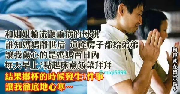 我和姐姐輪流顧重病的母親!誰知媽媽離世後遺產房子都給弟弟,讓我傷心的是,媽媽百日內,每天早上5點起床煮飯菜拜拜,結果擲杯的時候發生1件事,讓我徹底心寒…