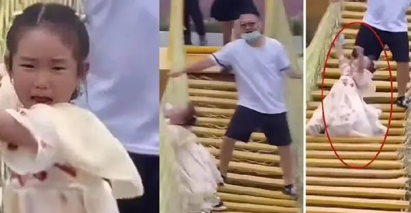 爸爸死命搖晃吊橋!女兒嚇哭手一鬆「縫隙掉下去」,真的悲劇了