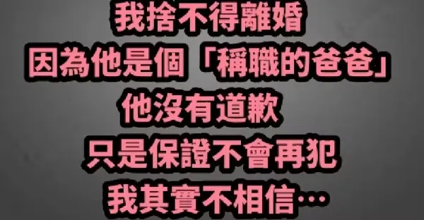 6年前,老公被我抓包「偷吃女同事」!我捨不得離婚,因為他是個「稱職的爸爸」,他沒有道歉,只是保證不會再犯,我其實不相信… 每年都想「再試一年看看」,不知道還能撐多久