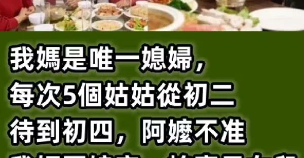 我媽是唯一媳婦,每次5個姑姑從初二待到初四,阿嬤不准我媽回娘家,怕寶貝女兒沒飯吃,1誇張要求…吃相超難看‼️