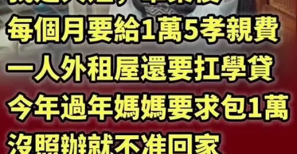 我是大姐,畢業後每個月要給1萬5孝親費,一人外租屋還要扛學貸,今年過年媽媽要求包1萬,沒照辦就不準回家,結果這個月忘了匯款,手機竟傳來一封簡訊…真的笑哭了!