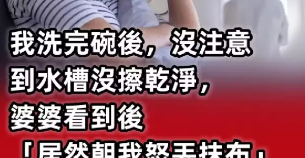我洗完碗後,沒注意到水槽沒擦乾淨,婆婆看到後「居然朝我怒丟抹布」,讓我當場委屈哭了,轉身看到老公「我卻立刻破涕而笑」…