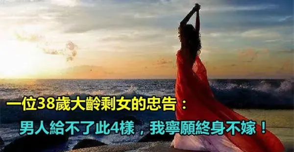 婚姻最將就不得!一位38歲大齡剩女的忠告:男人給不了此4樣「我寧願終身不嫁」 不要為「不值得的婚姻」委曲求全