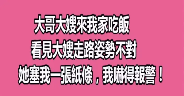 大哥大嫂來我家吃飯,看見大嫂走路姿勢不對,她塞我一張紙條,我嚇得報警