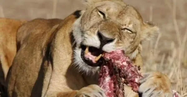 饑腸轆轆的母獅按倒野牛,剛要美餐下秒「屎漿噴滿臉」,母獅表情複雜生無可戀