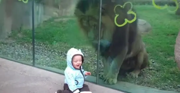 獅子看到小寶寶瞬間「獸性大發」,不料寶寶回頭一看,獅子反應太逗了