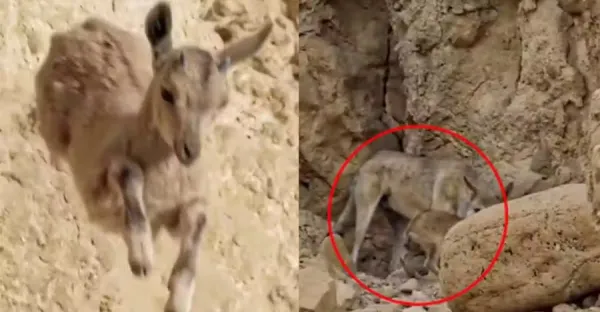 沙漠狼攔住羊群去路,領頭羊踢落小羊下懸崖,羊群獲救小羊落入狼口