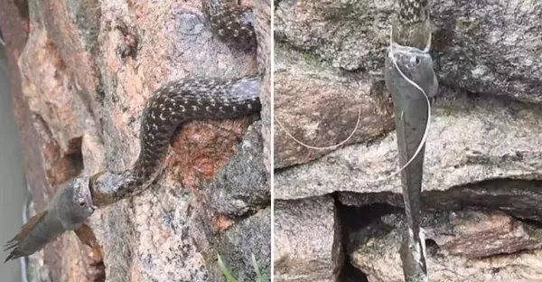水蛇大戰鯰魚!剛含住蛇頭,萬萬想不到「黃雀在後」,結局厲害了