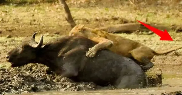 水牛被困泥潭,又遭母獅鎖喉,絕望時回頭「看到它們」,卻瞬間有勁了