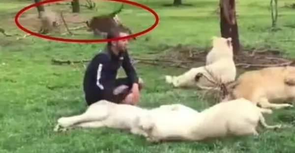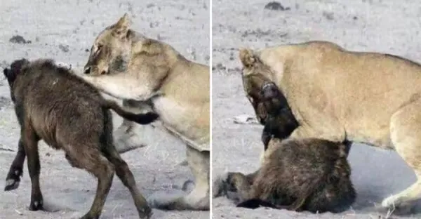 母獅本想趁母牛不在「偷襲」小牛犢,結果一回頭仿佛感覺「死神降臨」