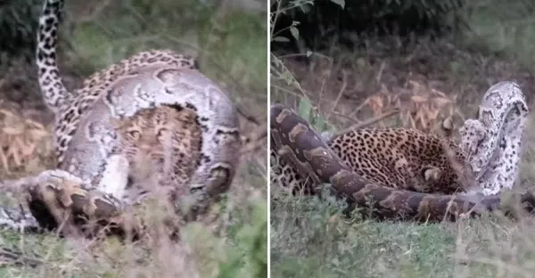 巨蟒搶得先機緊纏花豹「狠絞」,花豹冷靜處理絕處逢生,逆境中「穩准狠」咬碎「蛇頭」成功反擊