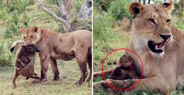 母獅喪子悲痛拿狒狒撒氣,一口鎖喉母狒狒搶走狒寶寶,抱在懷裡當崽養