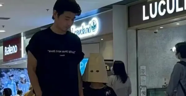 蔡少芬惡搞兒子用紙袋套頭逛街,張晉牽著樂兒不敢抬頭,畫風太搞笑了