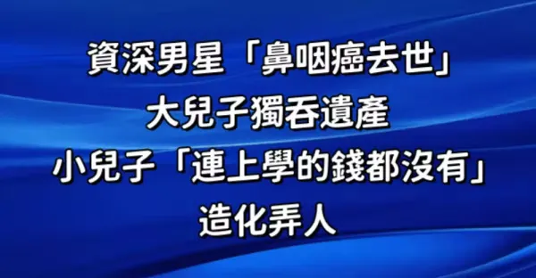 資深男星「鼻咽癌去世」,大兒子獨吞遺產 小兒子「連上學的錢都沒有」:造化弄人