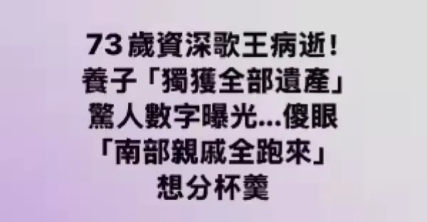 73歲資深歌王病逝!養子「獨獲全部遺產」驚人數字曝光...傻眼 「南部親戚全跑來」想分杯羹!