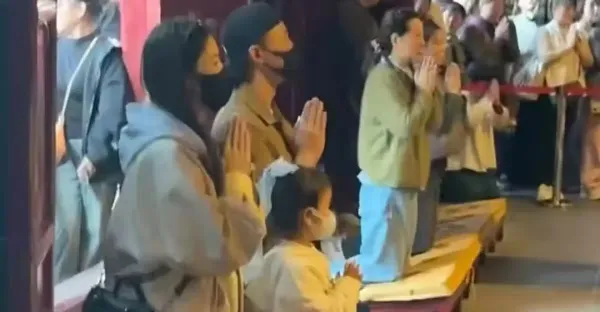 林峯一家三口現身普陀山,疑似為求二胎生子,張馨月背過氣款奢包