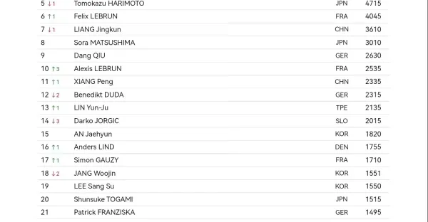 最新世界排名孫穎莎王楚欽第一,小勒布倫升至第5,莫雷加德第4