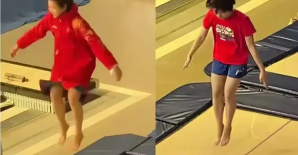 最新消息!全紅嬋凌晨3點決賽,訓練場邊鬆弛感滿滿,時不時在蹦床表演空翻動作