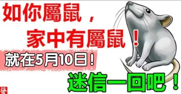 如果你不屬鼠,你最愛的人屬鼠,或家中有屬鼠!5月10日迷信一回吧!