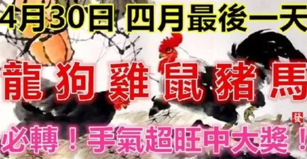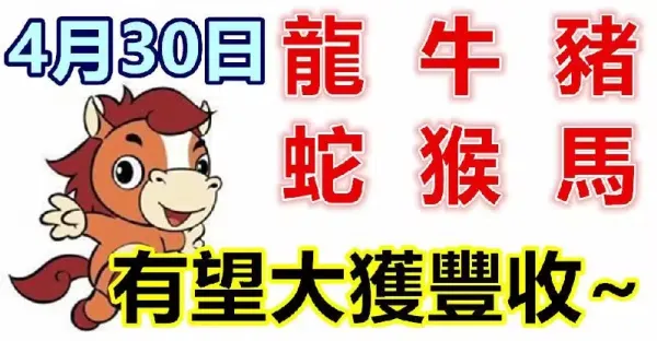 4月30日,四月的最後一天(龍、狗、雞、鼠、豬、馬)手氣超旺中大獎