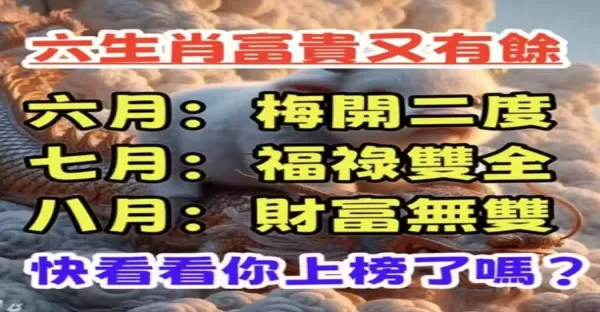 六生肖富貴又有餘,六月梅開二度,七月福祿雙全,八月財富無雙