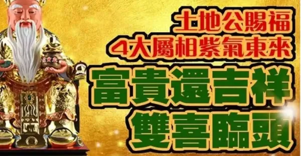 土地公賜福,四大屬相紫氣東來,富貴還吉祥,雙喜臨頭快來接