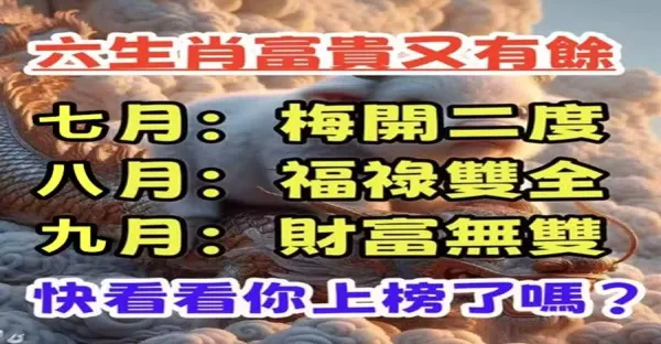六生肖富貴又有餘,7月梅開二度,8月福祿雙全,9月財富無雙