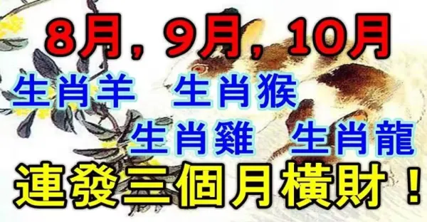 8月,9月,10月(生肖羊,生肖猴,生肖雞,生肖龍)連發三個月橫財