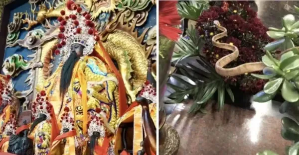 10年沒缺席!南投玄天上帝「蛇將軍」每逢端午現身 攀上供花「向帝爺公鞠躬行禮」廟方:牠很有靈性