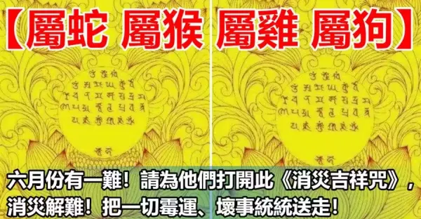 【屬蛇 屬猴 屬雞 屬狗】六月份有一難!請為他們打開此《消災吉祥咒》,消災解難!把一切霉運、壞事統統送走!